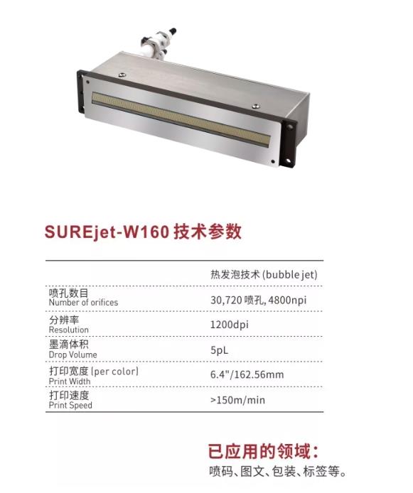 針對廣大工業(yè)寬幅噴墨設(shè)備制造商,上海銳爾發(fā)推出的這款SUREjet-W160打印噴頭通過超寬的打印寬幅與超高的噴孔密度實現(xiàn)超高速度的高質(zhì)量single pass打印。由于能夠?qū)崿F(xiàn)穩(wěn)定的發(fā)射速度與墨滴體積,在噴碼、圖文、包裝、標(biāo)簽等領(lǐng)域皆能保證不錯的效果。