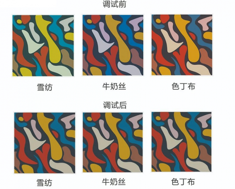 不同材料之間,銳印北斗版同樣能做到相同的顏色表現(xiàn),通過雪紡、牛奶絲、色丁布等面料追色,在不同材質(zhì)上實(shí)現(xiàn)色彩打印的效果一致性