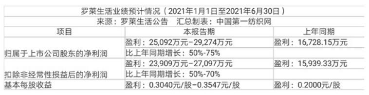 羅萊生活此前披露2021年上半年業(yè)績(jī)預(yù)告,預(yù)計(jì)報(bào)告期內(nèi)歸屬于上市公司股東的凈利潤(rùn)2.51億元-2.93億元,比上年同期增長(zhǎng)50%-75%;對(duì)于業(yè)績(jī)變動(dòng)情況,羅萊生活解釋稱,公司發(fā)揮家紡行業(yè)的龍頭優(yōu)勢(shì)地位,抓住銷售旺季,充分利用春節(jié)、“五一”小長(zhǎng)假、“618”年中購(gòu)物節(jié)等節(jié)慶時(shí)點(diǎn)進(jìn)行品牌宣傳、營(yíng)銷活動(dòng),獲得了銷售收入的顯著增長(zhǎng)。