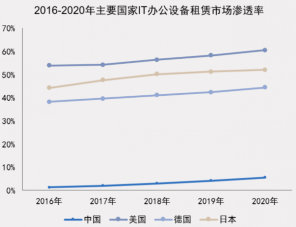 IT辦公設(shè)備運營可以幫助企業(yè)輕資產(chǎn)運營,在歐美等發(fā)達(dá)國家盛行,部分歐美國家滲透率超過60%。許多的跨國公司如谷歌、沃爾瑪、亞馬遜等公司都在采取輕資產(chǎn)化運營后,迅速成為行業(yè)的領(lǐng)頭羊。