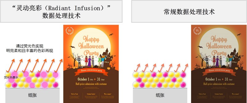 “靈動(dòng)亮彩(Radiant Infusion)”數(shù)據(jù)處理技術(shù)優(yōu)化了新開發(fā)的熒光粉色墨水與其他顏色墨水在紙張表面上的疊加方式,實(shí)現(xiàn)明亮柔和且豐富的色彩再現(xiàn),令圖像表達(dá)更具沖擊力。隨設(shè)備附贈(zèng)的海報(bào)制作軟件PosterArtist Lite(詳見第三段說明),可方便用戶輕松迅速的制作彩色海報(bào)。