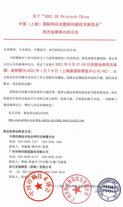 關于“2021 DS Printech China中國(上海)國際網印及數碼印刷技術展覽會”延期舉辦的公告