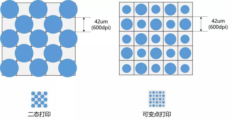 數(shù)碼打印在液滴量上也分為兩大類,二態(tài)打印和可變點打印。京瓷噴頭屬于后者,并且做到了高點火頻率下(30~40kHz)的4~5階的可變點打印。同打印濃度下,可變點的打印效果更為均勻,尤其是在打印純色塊,漸變細膩和細節(jié)豐富的圖案時,可變點的優(yōu)勢尤為明顯。