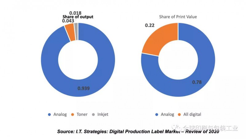 盡管對標(biāo)簽印刷機(jī)的投資越來越多,但所有數(shù)字印刷的壓敏標(biāo)簽的總份額仍然相對較小,僅占所有印刷品的6%以上。建立時間較長的碳粉印刷在數(shù)字印刷方面處于領(lǐng)先地位,噴墨技術(shù)正迎頭趕上。由于數(shù)字服務(wù)于高利潤、短版市場,所生產(chǎn)標(biāo)簽的價值要高得多。如果從產(chǎn)品價值,而非印刷總量來看的話,數(shù)字印刷在標(biāo)簽市場大概占有22%的份額,而且預(yù)計這一部分將繼續(xù)快速增長。