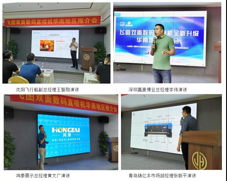 東道主深圳嘉豪博業(yè)數(shù)碼科技有限公司總經(jīng)理李偉首先致歡迎詞并傳遞了活動(dòng)意義;主辦方沈陽飛行船數(shù)碼噴印設(shè)備有限公司(以下簡(jiǎn)稱飛行船)副總經(jīng)理王智勛詳細(xì)介紹了飛圖TDL2000單雙面工業(yè)直噴機(jī)的產(chǎn)品特性和國內(nèi)外成功應(yīng)用案列場(chǎng)景;兄弟單位鴻泰廣告展示布料國際供應(yīng)商(以下簡(jiǎn)稱鴻泰)總經(jīng)理黃文廣介紹了直噴材料在國內(nèi)外的應(yīng)用展示,為熱轉(zhuǎn)印業(yè)務(wù)拓展提供了明晰的思路;青島錦億豐智能科技有限公司(以下簡(jiǎn)稱錦億豐)市場(chǎng)部經(jīng)理張新平介紹了針對(duì)小康絲路系列紡織品發(fā)色機(jī)系列產(chǎn)品。嘉賓們的演講讓與會(huì)嘉賓了解到當(dāng)下直噴市場(chǎng)的應(yīng)用情況、以及未來直噴市場(chǎng)應(yīng)用的前瞻性方向,大家開拓了市場(chǎng)視野。