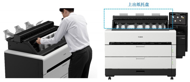 imagePROGRAF TZ-5300/5300 MFP首次搭載了“卷紙熱插拔更換”技術,當用戶打印作業(yè)通過頂部接紙托盤收納打印件時,可以實現在打印過程中更換紙張。例如當打印機正在進行大批量的圖紙打印,上卷軸的紙張已經用完,打印機正在使用下卷軸的紙張,這時用戶可以打開上卷軸蓋板將新的卷紙安裝到打印機中,直接減少了停機時間。同時與原有的“墨盒熱插拔更換”功能相結合,能進一步減少因耗材更換所帶來的停機等待時間,充分確保了高產能的打印。