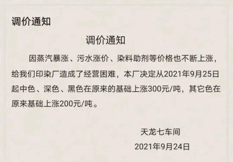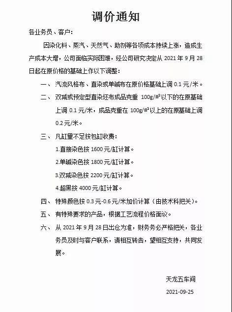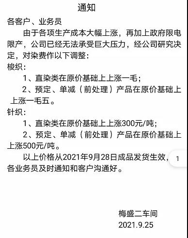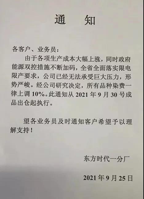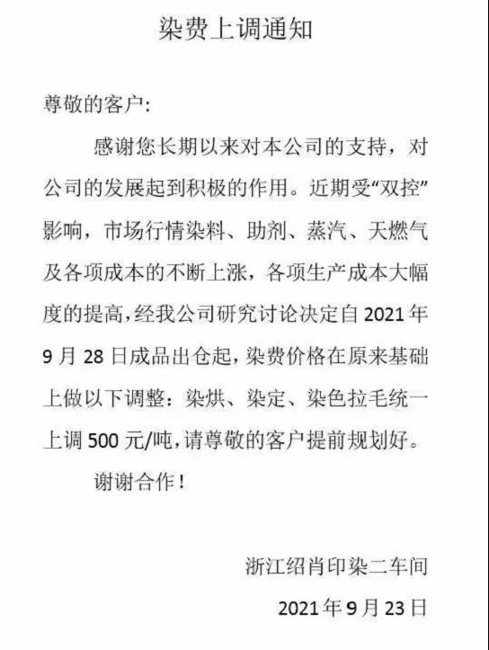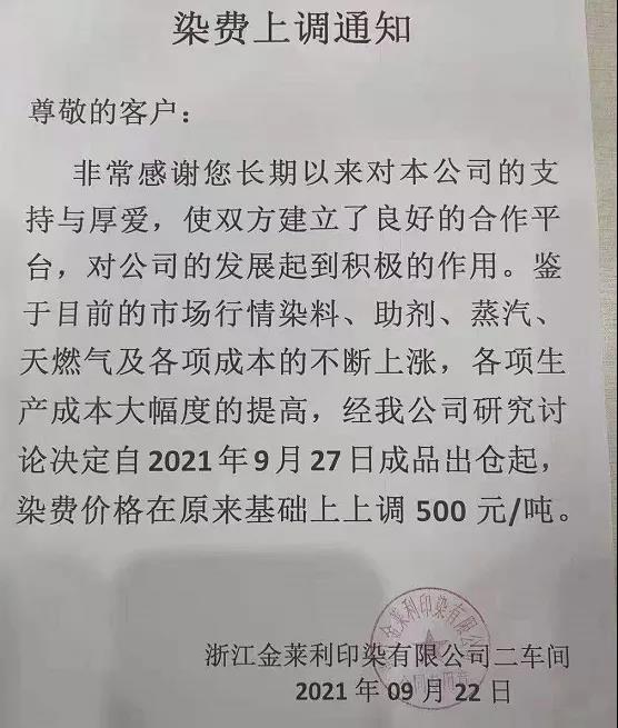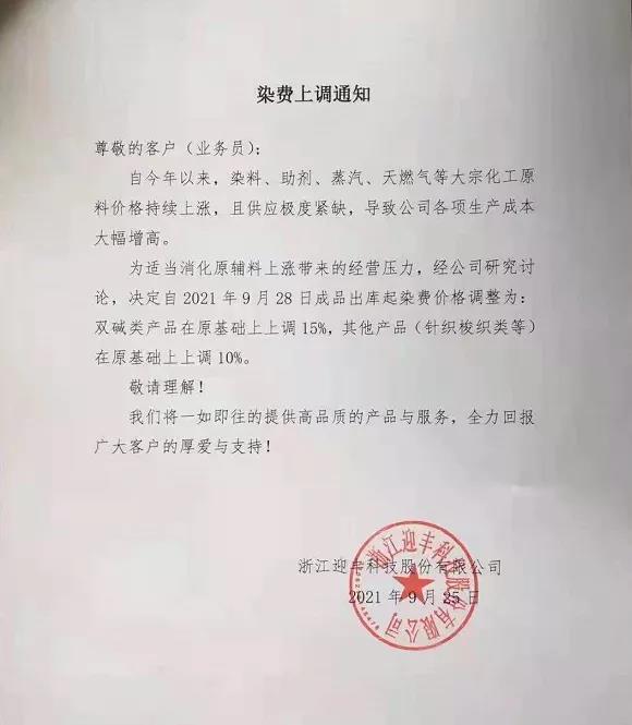 9 月 25日,浙江迎豐科技股份有限公司發(fā)布《染費(fèi)上調(diào)通知》,決定自 9月 28日成品出庫染費(fèi)價(jià)格進(jìn)行調(diào)整。具體為:雙堿類產(chǎn)品上調(diào)15%,針織梭織類上調(diào)10%。