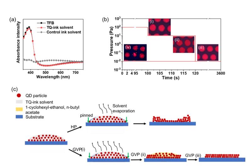 圖2.(a)TQ-ink墨水對(duì)下層友好,(b)不同真空方式對(duì)打印形貌的影響,(c)TQ-ink搭配GVP方式成膜機(jī)理圖