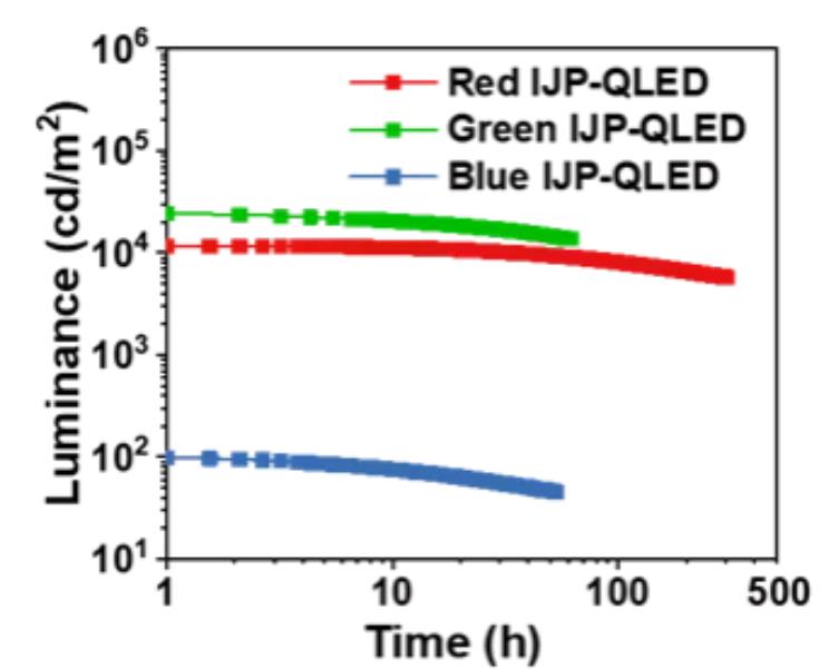 基于TQ-ink體系和GVP技術(shù),我們?cè)赥FB上印刷了一層均勻的QD,其粗糙度小于1nm。墨水體系與TFB層正交;TFB沒有損傷。因此,漏電流大大降低,電荷注入顯著增強(qiáng),從而使印刷器件具有優(yōu)異的性能。紅色I(xiàn)JP-QLED的最大亮度為104,679 cd/m2,最大EQE為19.3%,在1000 cd/m2時(shí)半亮壽命(T50)高達(dá)25,178 h。同時(shí),采用相同TQ-ink系統(tǒng)和GVP方法的綠色和藍(lán)色I(xiàn)JP-QLED也表現(xiàn)出了出色的EQE(18.0%和4.4%)和運(yùn)行穩(wěn)定性(1000 cd/m2時(shí)壽命為20,655 h, 100 cd/m2時(shí)壽命為46h)。紅綠藍(lán) IJP-QLED的壽命和效率是迄今為止報(bào)道的印刷設(shè)備中最高記錄。