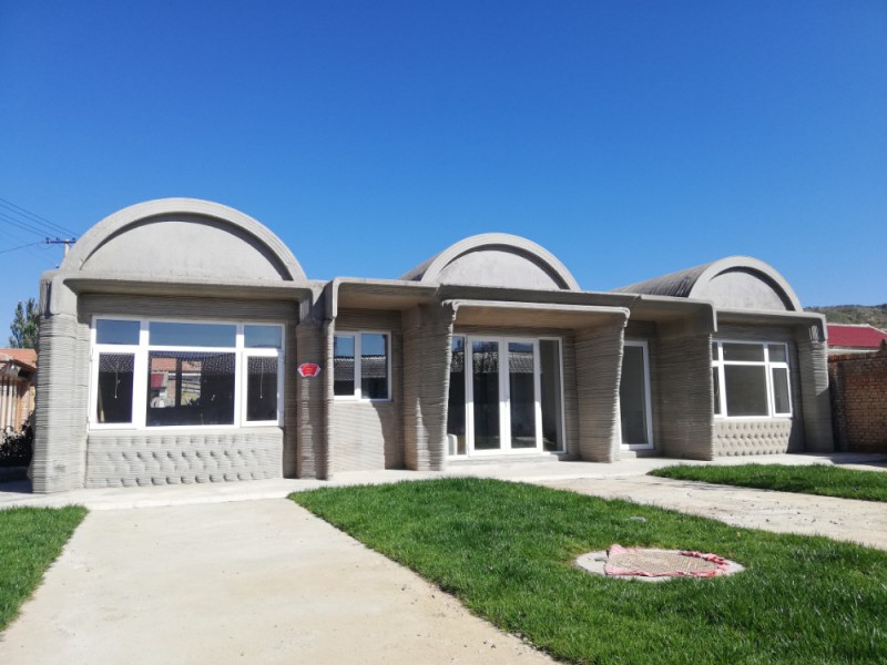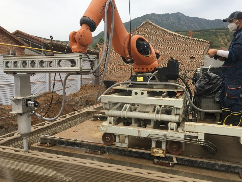 項(xiàng)目相關(guān)負(fù)責(zé)人介紹,按照預(yù)先設(shè)計(jì)的圖紙程序,該農(nóng)宅的打印施工,使用了3套機(jī)器臂3D打印混凝土移動(dòng)平臺(tái),分別放置在3大開(kāi)間中央,直接進(jìn)行基礎(chǔ)及墻體的原位打印,同時(shí)在建筑室外的機(jī)器臂軌道兩側(cè),現(xiàn)場(chǎng)預(yù)制打印了所有筒拱屋頂,并用吊機(jī)將筒拱屋頂裝配到打印的墻體上面。建筑的外墻采用了編織紋理作為裝飾,它與結(jié)構(gòu)墻體一體化打印而成,墻體中央灌注保溫材料,形成裝飾、結(jié)構(gòu)、保溫一體化的外墻體系。打印平臺(tái)也只需2人操作,即可完成整棟房屋的打印建造,最大可能減少了打印建造過(guò)程中所需的人力投入。