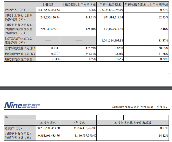 納思達(dá)發(fā)布公告稱,2021年前三季度,公司實(shí)現(xiàn)營(yíng)業(yè)收入150.25億元,同比增長(zhǎng)0.83%;歸屬于上市公司股東的凈利潤(rùn)6.75億元,同比增長(zhǎng)62.53%。其中,2021年第三季度,公司實(shí)現(xiàn)營(yíng)業(yè)收入51.18億元,同比增長(zhǎng)2.08%;歸屬于上市公司股東的凈利潤(rùn)2.49億元,同比增長(zhǎng)343.11%。