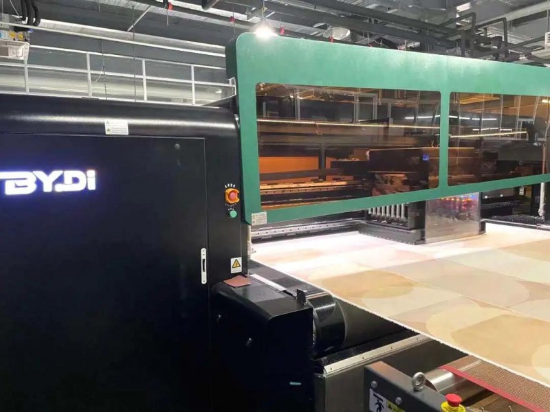 印花廠房?jī)?nèi),一臺(tái)32頭的博達(dá)涂料數(shù)碼高速打印機(jī)正在進(jìn)行訂單生產(chǎn),這也是國內(nèi)落地的第一臺(tái)32頭博達(dá)(博?。┩苛蠑?shù)碼打印設(shè)備。工作人員告訴我們,這臺(tái)涂料數(shù)碼印花機(jī)今年七月份才剛剛新上,與一臺(tái)8頭涂料打樣設(shè)備相互配合,足以實(shí)現(xiàn)高效的快返訂單生產(chǎn)。目前正在打印的就是用于制作嬰幼兒產(chǎn)品的紗布訂單,打印完成后就將發(fā)向澳大利亞。