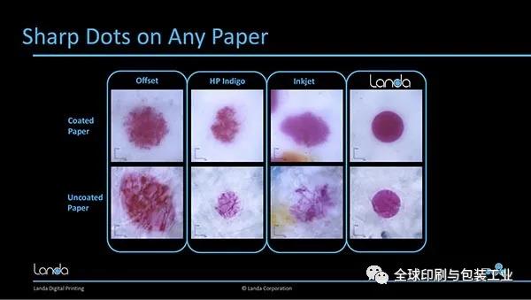 布朗還討論了瀾達(dá)技術(shù)提供的獨(dú)特油墨轉(zhuǎn)移工藝,該工藝可實(shí)現(xiàn)令人難以置信的圖像清晰度。他說(shuō):“即使在回收紙和牛皮紙上,我們轉(zhuǎn)移油墨的方式也會(huì)產(chǎn)生令人難以置信的銳利點(diǎn)。”(見(jiàn)下圖)。他還指出印刷機(jī)能夠達(dá)到96%的PMS顏色。