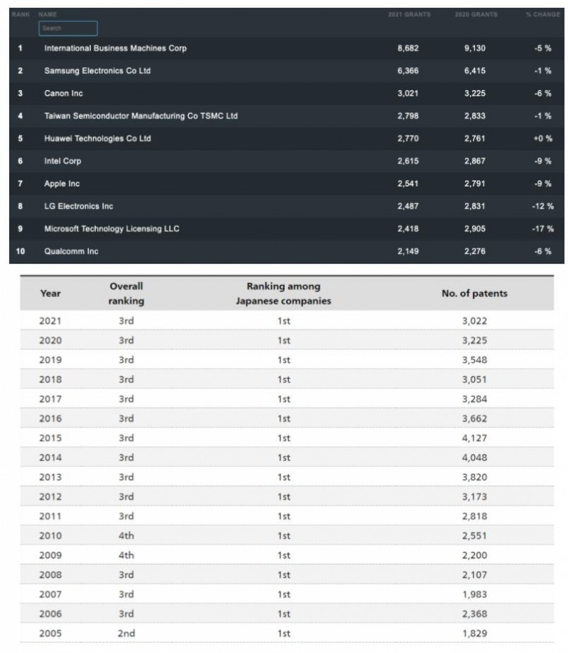 近日,專利數(shù)據庫提供商IFI Claims Patent Services發(fā)布的最新研究報告顯示,老牌打印廠商佳能2021年獲得了3021件美國專利(佳能官方公告3022件),排名第三。由此將連續(xù)專利數(shù)排名前5的歷史延長到了36年,且是全球唯一。同時佳能是日本公司在美獲取專利數(shù)連續(xù)17年排名第一。