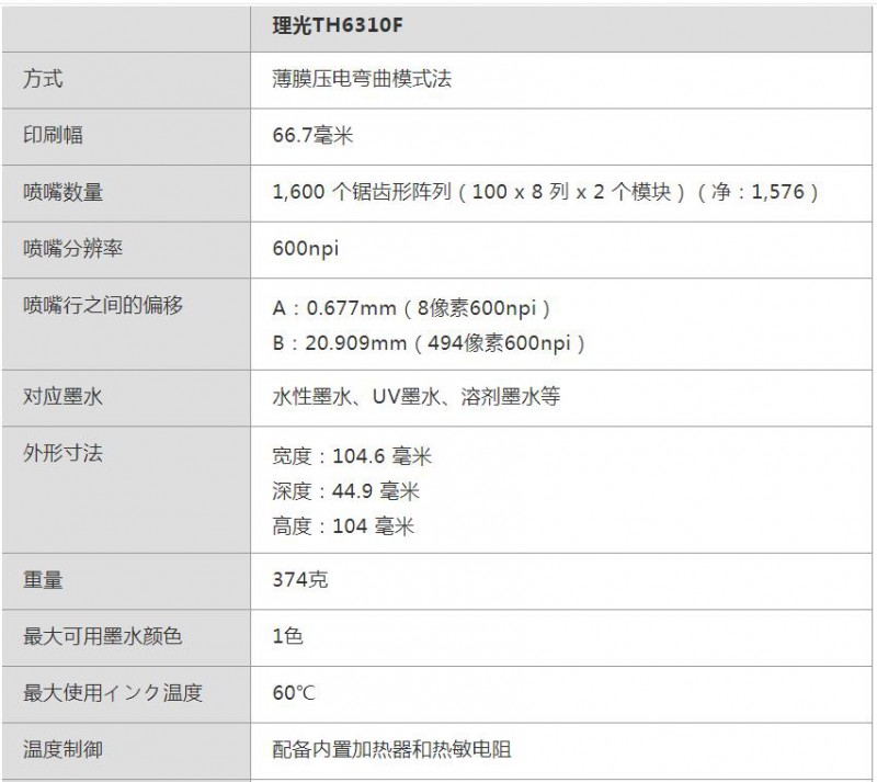 印花社獲悉:理光繼G5、G6打印頭之后,又推出了一款TH6310F打印頭,主要針對(duì)紡織面料直噴數(shù)碼印花和其他領(lǐng)域的應(yīng)用。據(jù)說(shuō),國(guó)內(nèi)已有數(shù)碼印花機(jī)器廠家正在使用這款噴頭研發(fā)~綜合性能堪比目前市場(chǎng)一些主流噴頭~