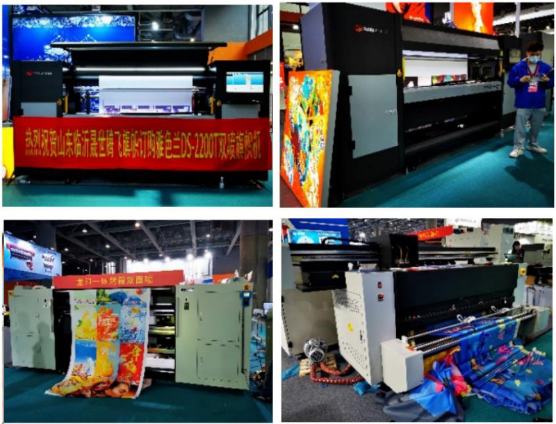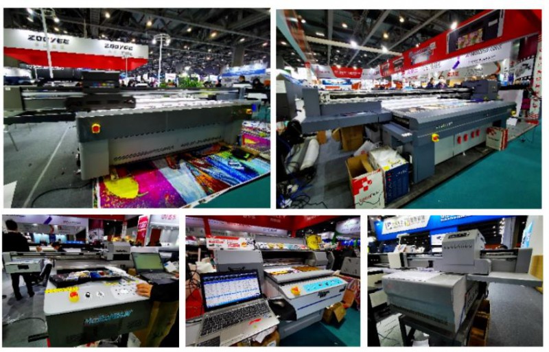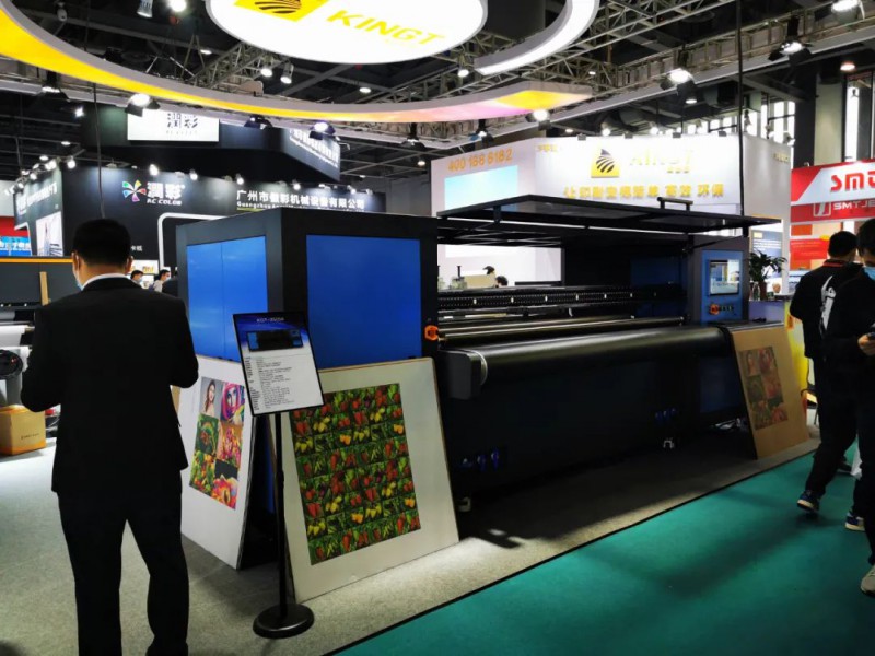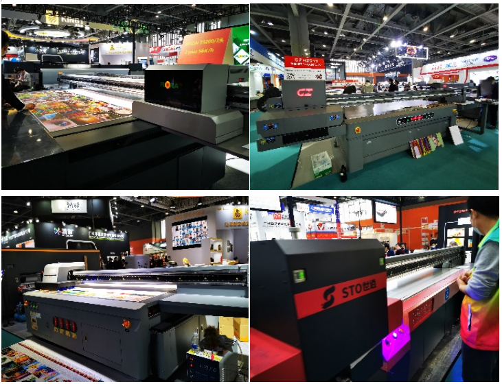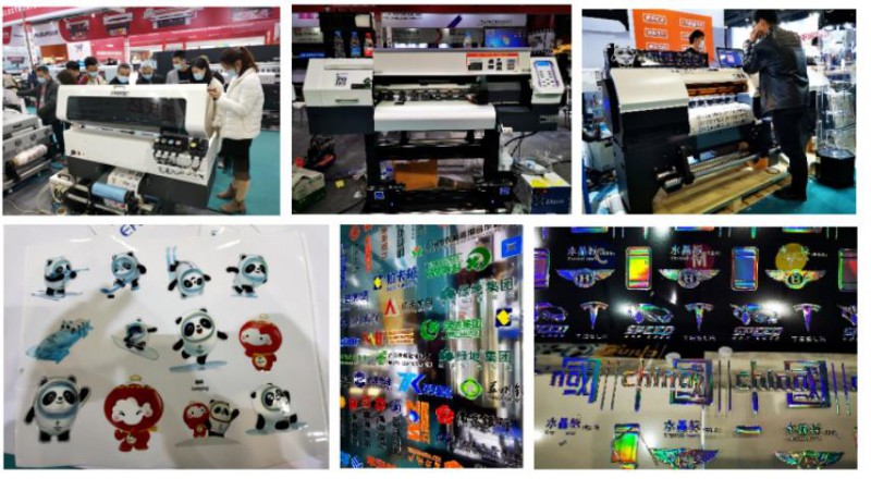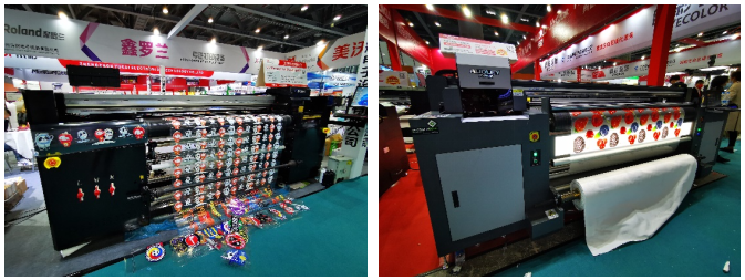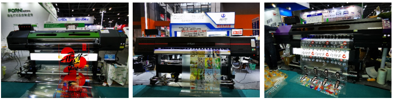 通過走訪小編發(fā)現(xiàn),今年的方案呈現(xiàn)一應(yīng)俱全,有近兩年來熱度不減的彩白彩工藝、不同幅寬的抖粉燙畫打印方案;有工藝技術(shù)日趨成熟,可部分取代絲印等傳統(tǒng)印刷工藝的水晶標(biāo)打印轉(zhuǎn)移方案;有旗幟布、貢緞等雙噴布類直噴方案;有針對PU等皮革的水性、UV打印方案;有針對瓦楞包裝領(lǐng)域的掃描式印刷方案;有針對工業(yè)領(lǐng)域小微物品視覺定位的打印方案;有圓柱體椎體360度無拼接打印的方案;有針對異形和高落差的微高噴打印的方案;也有針對水晶標(biāo)的燙金燙銀新方案以及卷材、板材上的UV光油燙金方案等等。各大品牌各有所長。