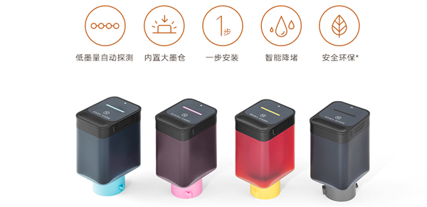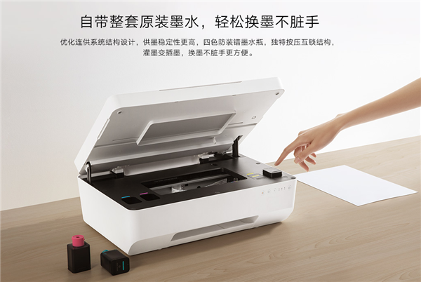 新品采用優(yōu)質(zhì)原裝四色燃料墨水,色彩更真實,墨水瓶采用隱性警示燈設計,低墨量下自動提示。