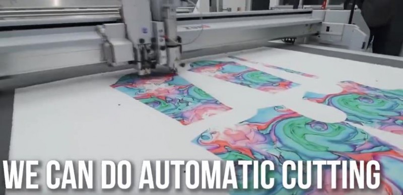 從 Presto S 送入的印花織物準備好被 Zund 激光切割機切割