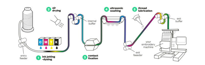 要使用多種顏色,傳統(tǒng)刺繡必須使用多個(gè)線軸,每種顏色一個(gè)。這會(huì)影響效率并由于重新線程化而損失時(shí)間,從而增加了流程的成本。它還限制了工業(yè)可以采用的設(shè)計(jì)范圍。