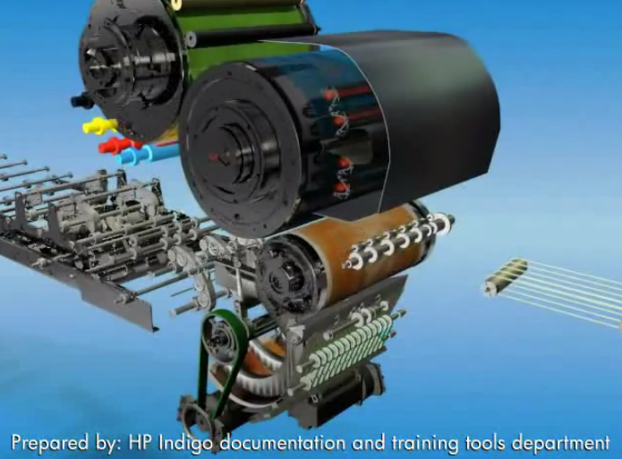使用電子油墨的惠普Indigo數(shù)字印刷機本質(zhì)上是一款特殊的激光成像數(shù)字印刷機, 因為有一道橡皮布轉(zhuǎn)印的過程, 也被稱為數(shù)字版彩色膠印機。