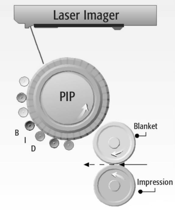 因為indigo獨特的液體電子油墨的特性, 在轉(zhuǎn)印過程中版印滾筒每印刷一個顏色旋轉(zhuǎn)一周而且橡皮布上不會留下油墨印跡, 這可以允許Indigo印刷機只有一組滾筒就可以印刷所有色序。