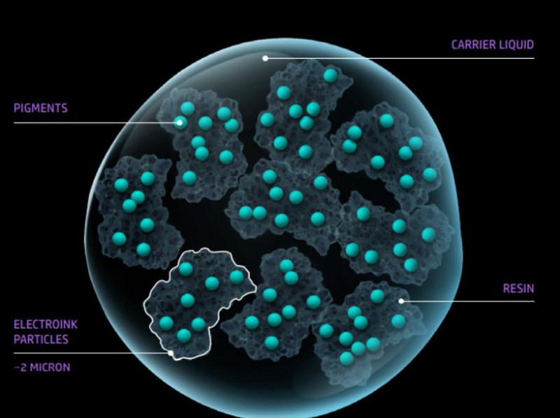 Indigo印刷機這種獨一無二的液體電子油墨包含很小的可以充電的顏料(Pigments)墨滴(ElectroInk Particles), 可以在任何承印物上產(chǎn)生非常薄的墨層。其直徑1-2μm, 包含在絕緣的攜帶液(Carrier Liquid)中, 可以保證圖像的高解析度和高清晰度。電子油墨的固化依賴于油墨中的新型樹脂材料(Resin), 在與紙或其他承印物接觸時可以立即固化, 印出的圖像更銳利, 網(wǎng)點沒有虛化的邊緣及擴散。