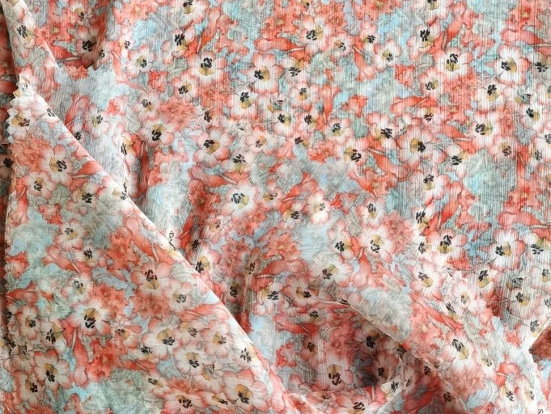 還有一種就是純醋酸的印花,這個面料品種也有自己的優(yōu)點(diǎn)。因?yàn)檫@種材質(zhì)可以生物降解,且同時擁有真絲的光澤,所以說受到一些大品牌的青睞,因?yàn)橛锌沙掷m(xù)環(huán)保的一個概念在里面。但做這種品種面料的印花,難度就特別高。首先蒸化水洗步驟是避免不了高溫的。那么在這樣的環(huán)境下,他的撕破強(qiáng)度就會有一定的受損。其次這款面料比較嬌嫩,經(jīng)過蒸化等染整過程中的加工,可能也出現(xiàn)一些棘手的問題。