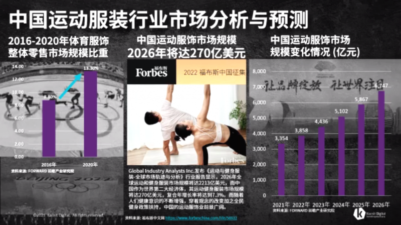 2016年至2020年,體育服飾整體零售市場占規(guī)模比重從8.80%增長至13.30%,到2026年,中國運(yùn)動(dòng)服飾市場規(guī)模則將達(dá)到270億美元