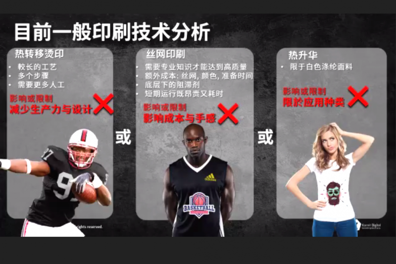 在全新的時(shí)尚發(fā)展趨勢下,市場對(duì)印花技術(shù)提出了個(gè)性化、按需生產(chǎn)以及可持續(xù)時(shí)尚的全新要求。而目前普遍應(yīng)用于服裝印花的熱轉(zhuǎn)移燙印、絲網(wǎng)印刷及熱升華等工藝普遍在滌綸面料上存在著顏色深度和清晰度不夠、容易滲色、印花部分手感硬等各式各樣的技術(shù)挑戰(zhàn)。