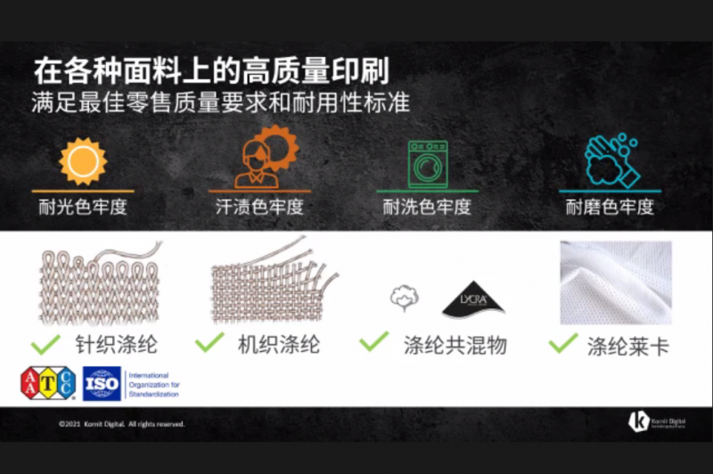 接下來,會(huì)議直播連線康麗數(shù)碼位于香港的演示中心現(xiàn)場為大家?guī)砹薑ornit Avalanche Poly Pro的打印演示及應(yīng)用分享。通過整體解決方案的展示,Kornit Avalanche Poly Pro以其無設(shè)計(jì)限制,防止染料泳移、滿足各種面料上的高質(zhì)量印刷、達(dá)到運(yùn)動(dòng)與行業(yè)的最高要求以及可持續(xù)的印花工藝獲得了市場的廣泛認(rèn)可。據(jù)了解,目前在運(yùn)動(dòng)服集聚的泉州地區(qū),已有康麗的企業(yè)用戶正在應(yīng)用這套方案。