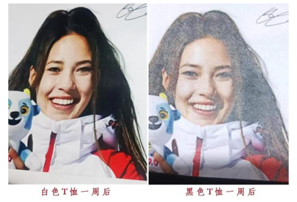 這類現(xiàn)象與燙畫紙或燙畫膜無關(guān)。這是在深色滌綸面料上燙畫的常見現(xiàn)象,原因是滌綸面料染色用的分散染料會逐漸遷移染色熱熔粉層及墨水層,色牢度不好的深色滌綸面料甚至一天就能看出圖像的模糊變化。