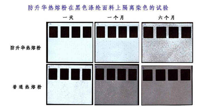 解決的方法是使用防升華熱熔粉和選擇色牢度好的面料,以下是一組防升華熱熔粉效果的試驗(yàn):