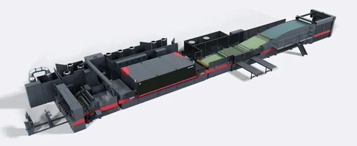 圖2.3 陶瓷噴墨打印機,裝配了過百只噴頭的single pass單程式印刷,使用易沉淀的無機顏料墨水,對不間斷高負荷生產(chǎn)有著極高的要求。目前這類設(shè)備只有工業(yè)級內(nèi)循環(huán)噴頭能滿足其應(yīng)用要求。