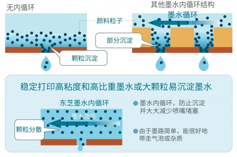 內(nèi)循環(huán)防止了大顆粒色料墨水沉淀,適應(yīng)更廣泛墨水應(yīng)用,如UV白墨,涂料墨水、陶瓷/玻璃無機墨水、高粘度墨水、特殊功能性液體。