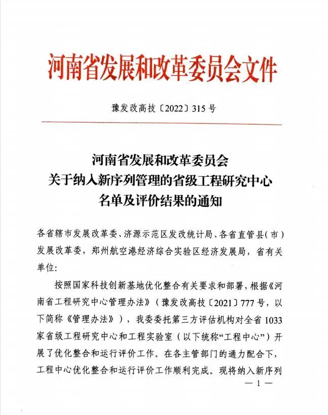 工程研究中心是河南省發(fā)改委根據構建一流創(chuàng)新生態(tài)需求,以提高自主創(chuàng)新能力為目標,組織具有較強研究開發(fā)能力和綜合實力的企業(yè)、高等院校和科研機構等建設的研究開發(fā)主體,是我省創(chuàng)新體系的重要組成部分,也是河南省實施創(chuàng)新驅動發(fā)展戰(zhàn)略的重載體。
