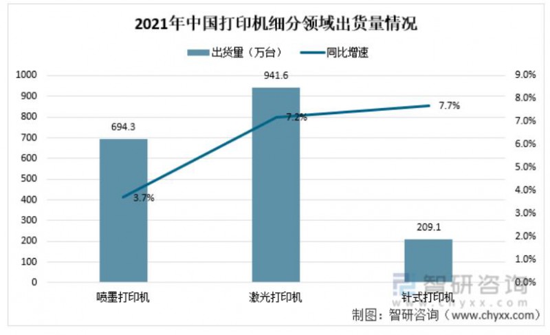從打印機(jī)細(xì)分領(lǐng)域出貨量情況看,2021年噴墨打印機(jī)出貨量694.3萬臺(tái),同比下降3.7%;激光打印機(jī)出貨量941.6萬臺(tái),同比下降7.2%;針式打印機(jī)出貨量209.1萬臺(tái),同比下降7.7%。