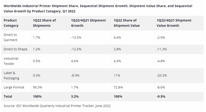 - 大幅面數(shù)字打印機(jī)的出貨量占工業(yè)打印機(jī)的大部分,與2021年第四季度相比,2022年第一季度下降不到2%。