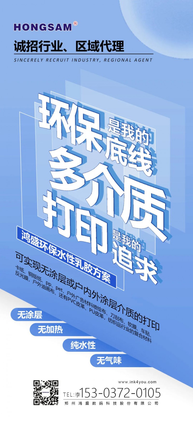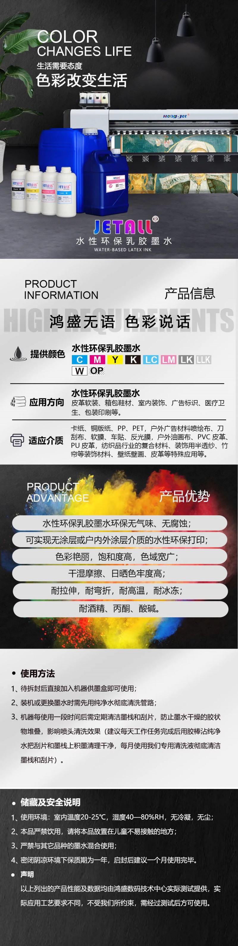 水性環(huán)保乳膠墨水,解決了水性墨水在非吸收材料的成像及牢度問題,同時具有高日曬牢度,加上其自帶的環(huán)保特性,乳膠墨水給噴墨行業(yè)帶來了很多驚喜,每一次墨水功能性的驗證、每一次應(yīng)用領(lǐng)域的拓展,都在宣告著噴墨打印行業(yè)屬于水性乳膠墨水的時代已經(jīng)開啟,正在助力傳統(tǒng)行業(yè)的數(shù)碼化進(jìn)程!