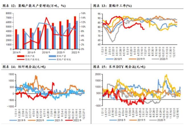 2022年3月份隨著俄烏戰(zhàn)爭(zhēng)爆發(fā)成本端原油大幅上漲,受國內(nèi)疫情拖累,在強(qiáng)成本弱需求背景下,聚酯利潤開始快速下降。3月下旬到5月初是全面虧損的階段。直到5月以后,國內(nèi)疫情逐步緩和,物流暢通,聚酯價(jià)格突破上漲,效益開始修復(fù)。6月下半月聚酯面臨的困境跟3月份如出一轍,聚酯原料價(jià)格快速下跌帶來的負(fù)反饋導(dǎo)致聚酯現(xiàn)金流虧損加劇,同時(shí)聚酯企業(yè)5月份以來庫存升值的紅利消失,且面臨快速貶值的壓力,高庫存的聚酯企業(yè)尤其是龍頭企業(yè)減產(chǎn)壓力再次加大。