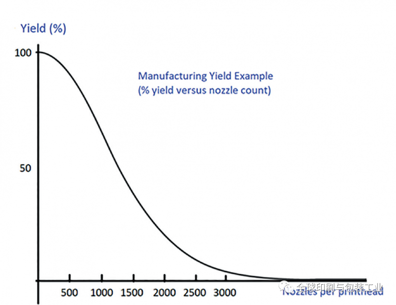 將噴頭中的噴嘴數(shù)量加倍(從 600dpi 變?yōu)?1200dpi 時(shí)會(huì)發(fā)生這種情況)不僅會(huì)使最終噴頭的制造良率減半,而且很可能會(huì)更大幅度地降低良率。這是因?yàn)榭傮w產(chǎn)量通常與噴頭中的噴嘴數(shù)量呈正態(tài)分布。一些噴頭制造商(例如京瓷)通過(guò)將每個(gè)噴頭組裝成多個(gè)較小的模塊來(lái)繞過(guò)此限制。