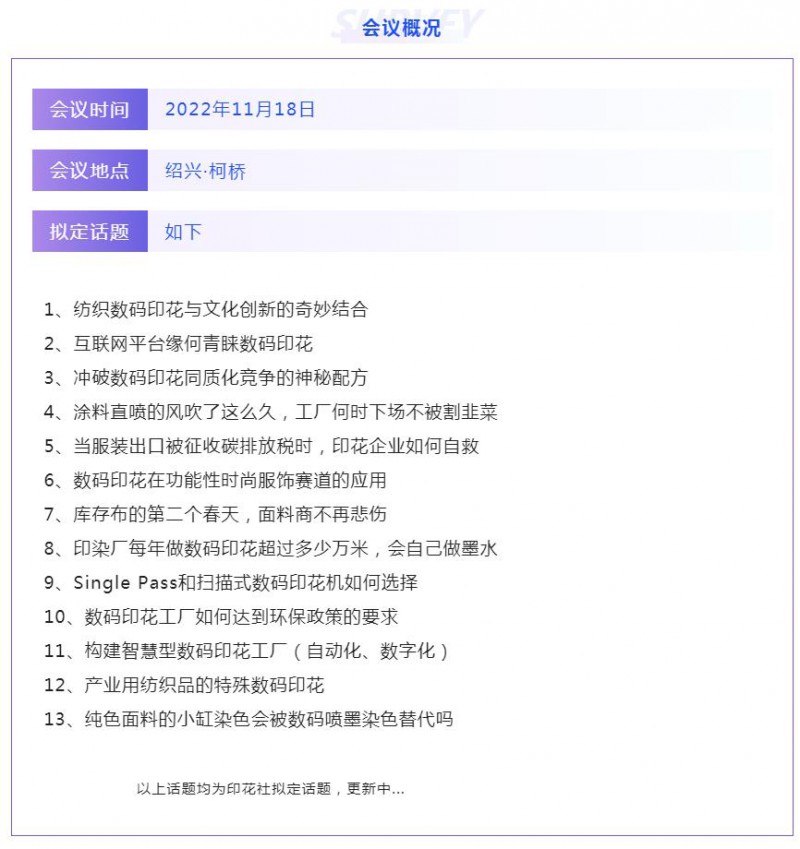 在產(chǎn)業(yè)升級和經(jīng)濟轉(zhuǎn)型的時代背景下,為探索數(shù)碼噴墨黑科技應(yīng)用邊際,推動數(shù)碼噴墨技術(shù)的產(chǎn)業(yè)配套,共創(chuàng)數(shù)碼噴墨應(yīng)用新模式!紡客傳媒旗下《印花社TopPrint》將于2022年11月18日在紹興柯橋舉辦《第七屆數(shù)碼印花引力峰會暨數(shù)碼噴墨染色技術(shù)論壇》。