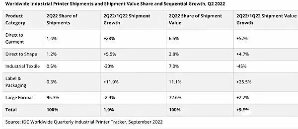 據(jù)IDC稱,不確定性仍然是工業(yè)打印機市場的主導主題。IDC的全球季度工業(yè)打印機跟蹤器提供了五個主要市場類別的總市場規(guī)模和供應商份額:大幅面、標簽和包裝、直接用于服裝、工業(yè)紡織品和直接成型。