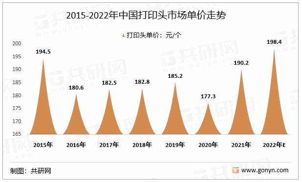 從均價來看,2015-2020年,我國打印頭市場單價總體呈下降趨勢,2021年回升至190.2元/個,預計2022年我國打印頭市場單價上漲至198.4元/個。