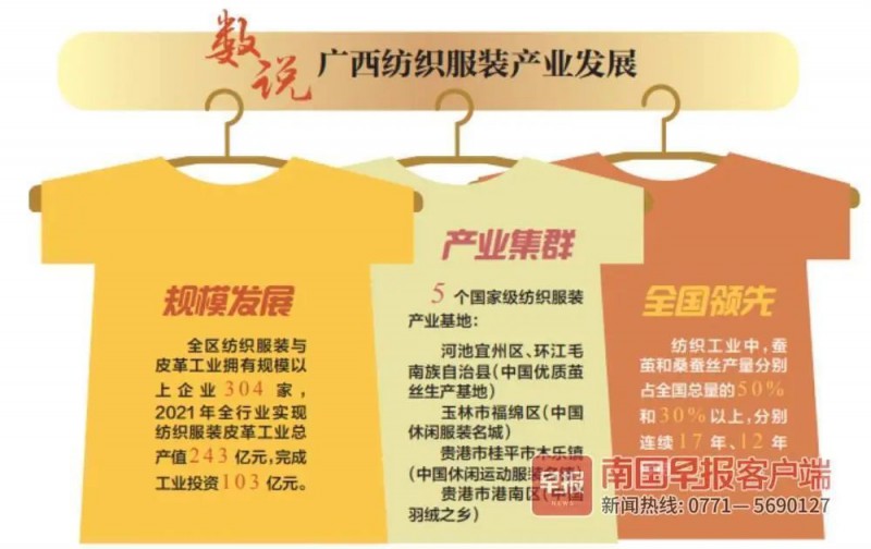 自治區(qū)工信廳有關(guān)人士告訴記者,經(jīng)過(guò)發(fā)展,廣西紡織服裝行業(yè)已產(chǎn)生集群效應(yīng)。目前,全區(qū)紡織服裝與皮革工業(yè)擁有規(guī)模以上企業(yè)304家,2021年全行業(yè)實(shí)現(xiàn)紡織服裝皮革工業(yè)總產(chǎn)值243億元,完成工業(yè)投資103億元。其中,全區(qū)紡織工業(yè)中,蠶繭和桑蠶絲產(chǎn)量分別占全國(guó)總量的50%和30%以上,分別連續(xù)17年、12年保持全國(guó)第一。