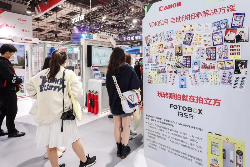 展臺上年輕人們排起長隊等待體驗的是“自助拍照亭”解決方案。拍立方通過SDK開發(fā),使用佳能EOS1500D和CP1300打印機(jī)打造了一個智能迷你照相館。在獨(dú)立空間內(nèi)即可完成,即拍即得,更有AI攝影+AI美顏加持,拍攝效果媲美影樓。