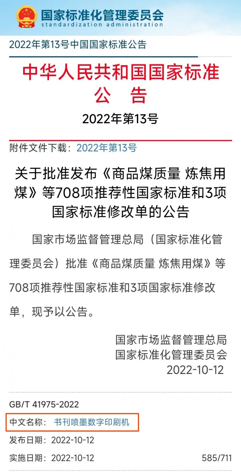 10月12日,為慶祝第五十三屆世界標(biāo)準(zhǔn)化日,國家市場監(jiān)管總局圍繞“美好世界的共同愿景”和“數(shù)字時(shí)代的標(biāo)準(zhǔn)化”主題,發(fā)布了一批重要標(biāo)準(zhǔn),GB/T 41975-2022《書刊噴墨數(shù)字印刷機(jī)》赫然在列。該標(biāo)準(zhǔn)的出臺填補(bǔ)了書刊出版領(lǐng)域數(shù)字印刷設(shè)備產(chǎn)品類標(biāo)準(zhǔn)的空白,為企業(yè)生產(chǎn)、用戶選型提供了權(quán)威技術(shù)依據(jù),勢必進(jìn)一步推動(dòng)噴墨印刷技術(shù)在書刊出版領(lǐng)域更廣泛的應(yīng)用。