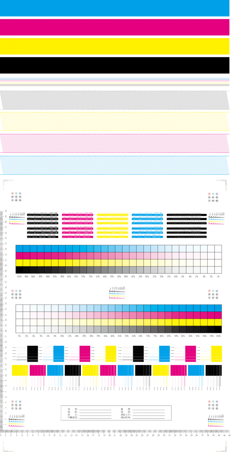 其中,印刷性能是標(biāo)準(zhǔn)中的核心部分,標(biāo)準(zhǔn)起草工作組自主研制了用于評價(jià)書刊噴墨數(shù)字印刷機(jī)的標(biāo)準(zhǔn)測試圖。在標(biāo)準(zhǔn)給出的試驗(yàn)條件下,對線條、文字、角線、米字線、分辨力線圖、線對圖、標(biāo)尺、實(shí)地色條以及階調(diào)梯尺的印刷能力進(jìn)行客觀評價(jià),可以有效評價(jià)書刊噴墨數(shù)字印刷機(jī)的印刷性能。