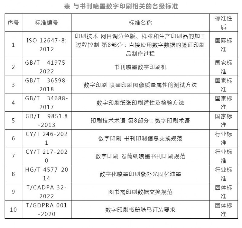 黨的十八大以來,通過一系列改革,我國構(gòu)建了政府主導(dǎo)制定標(biāo)準(zhǔn)和市場自主制定標(biāo)準(zhǔn)協(xié)同發(fā)展、協(xié)調(diào)配套的新型標(biāo)準(zhǔn)體系。近年來,與書刊數(shù)字印刷相關(guān)的國際標(biāo)準(zhǔn)、國家標(biāo)準(zhǔn)、行業(yè)標(biāo)準(zhǔn)以及團(tuán)體標(biāo)準(zhǔn)在陸續(xù)出臺(見下表),不同層級的標(biāo)準(zhǔn)從各自視角對印刷文件、印刷設(shè)備、數(shù)字印刷油墨以及印刷質(zhì)量等方面進(jìn)行了規(guī)范,凝聚了眾多行業(yè)專家的智慧和汗水,為我國書刊印刷的數(shù)字化轉(zhuǎn)型澆筑了堅(jiān)實(shí)的基座。