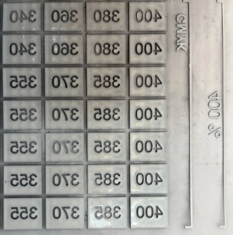 先彩后白打印在燙畫膜上,白墨墨量50%-80%階梯遞增,不流墨不淤墨即認(rèn)定為合格。
