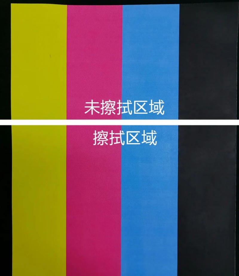 天威燙畫墨水干摩擦色牢度良好,均無掉色現(xiàn)象。在絕大部分燙畫膜上,濕摩擦色牢度依舊表現(xiàn)良好,部分廉價(jià)膜燙印成品存在輕微掉色現(xiàn)象,但并不影響成品顏色。